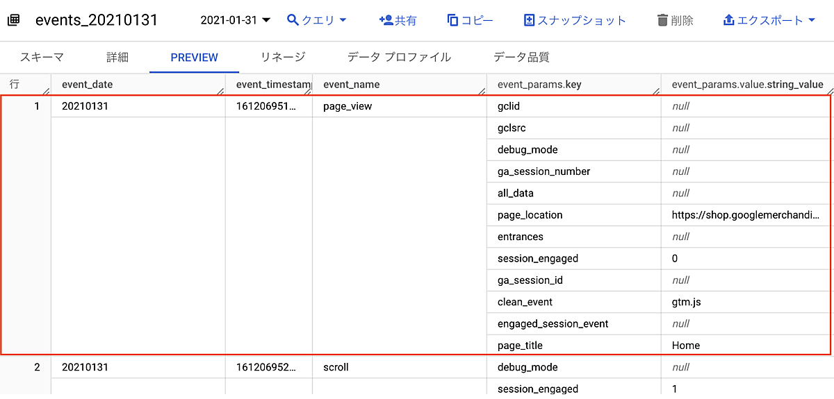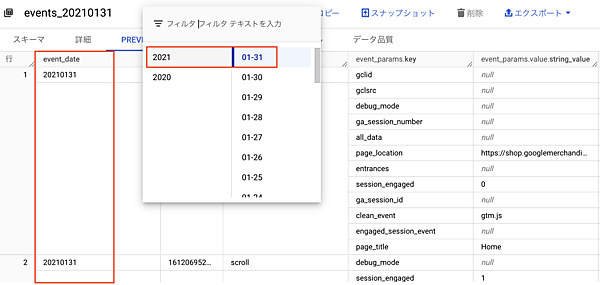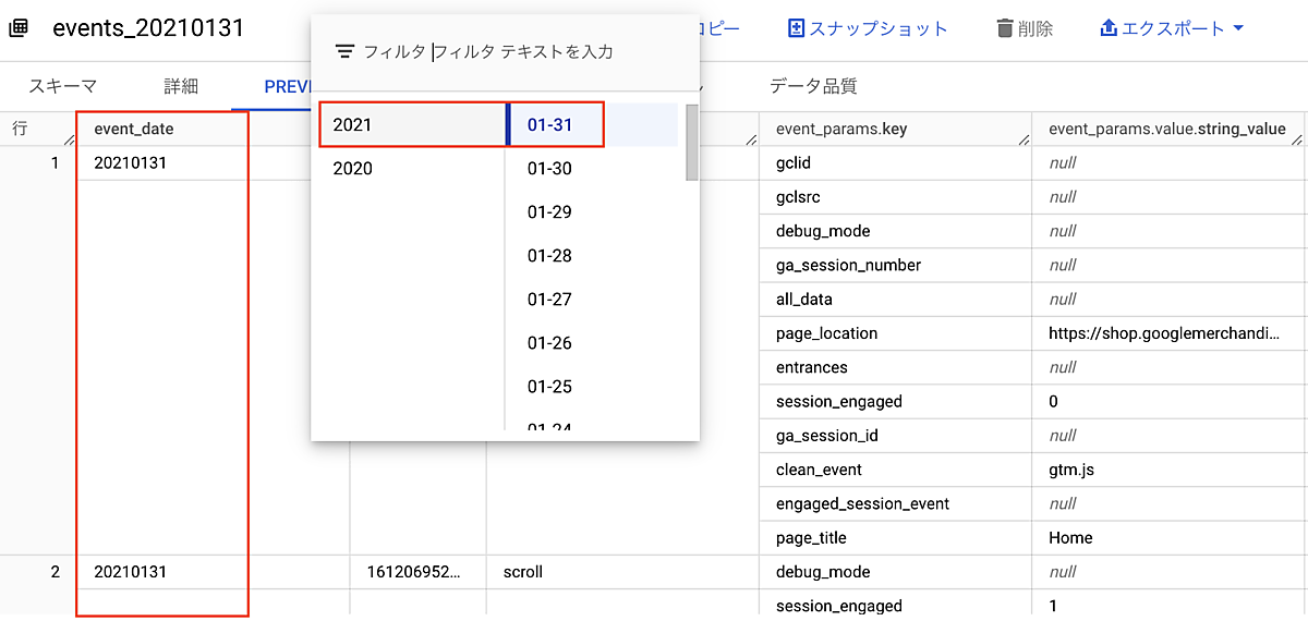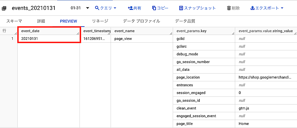 event_dateは、BigQueryのPREVIEW画面で確認すると、“20210131”という形で表示されています。これは日付型(DATE型)ではなく文字列型(STRING型)でイベントが発生した日を記録しているということです。