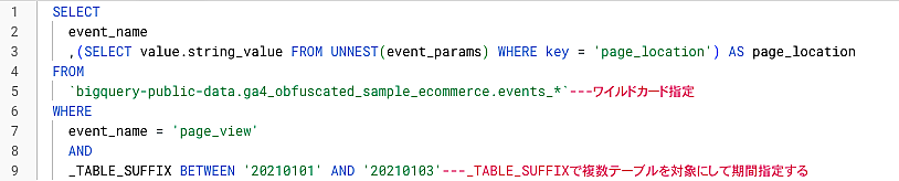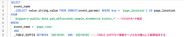 _TABLE_SUFFIX BETWEEN '20210101' AND '20210103'---_TABLE_SUFFIXで複数テーブルを対象にして期間指定する