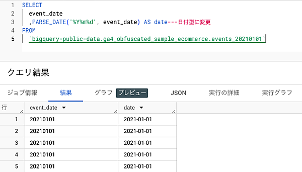 そのため、event_dateに記録されている日付のデータを、日付型(DATE型)で扱いたい場合には、日付型(DATE型)に変換するSQLクエリを書く必要があります。