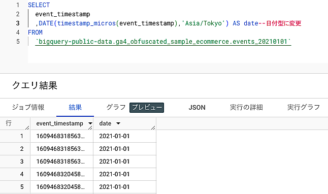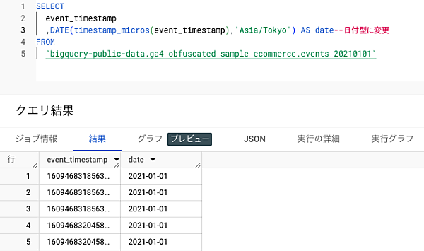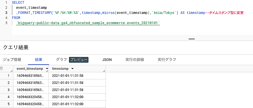 そのため、event_timestampに記録されている日時のデータを、日時の表示形式で扱いたい場合には、日時の表示形式に変換するSQLクエリを書く必要があります。