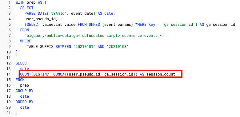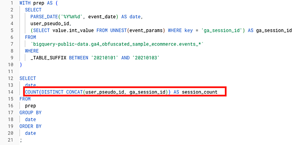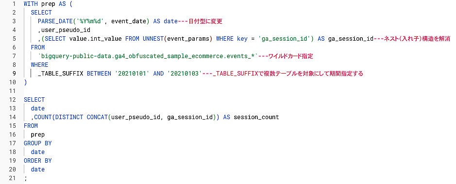 with句でprepと名前をつけて「日付型に変換して取り出したevent_date、user_pseudo_id、ネスト構造を解消して取り出したga_session_idのリスト」を作り、そこから日付とセッション数(user_pseudo_idとga_session_idを連結した値を重複を除いてカウント)を集計するという方法を使って、日次のセッション数を集計しています。