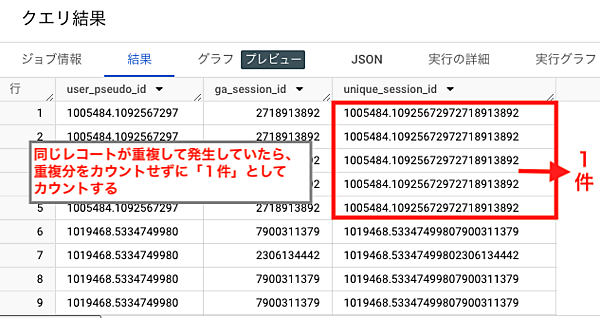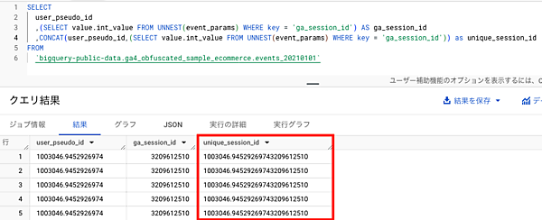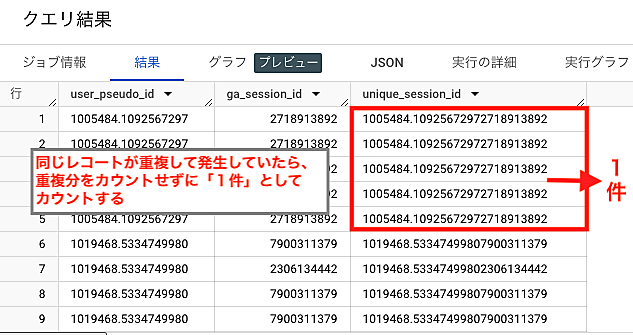 この算出方法を再現するために、「user_pseudo_id」と「ga_session_id」という値を連結してユニークセッションIDを作り、そのユニークセッションIDの重複を除いてカウントし、セッション数を算出するという方法をとっていきます。