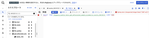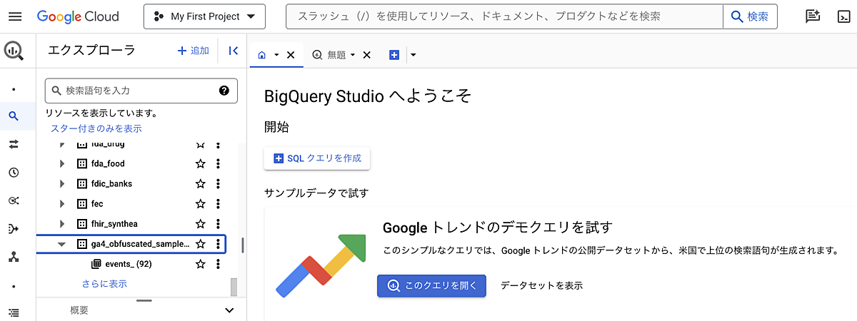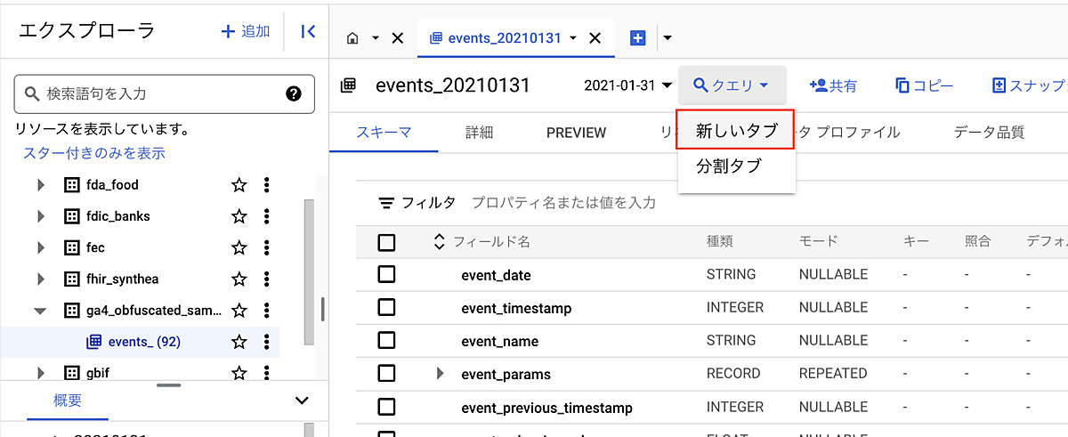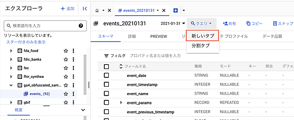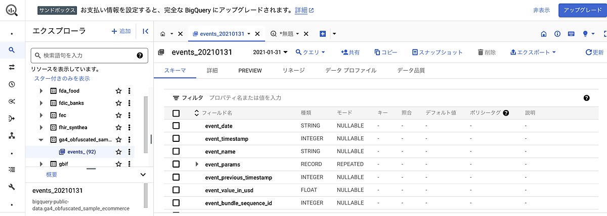 リンクをクリックすると、BigQueryが開いて、GA4のサンプルデータセットが表示されます。