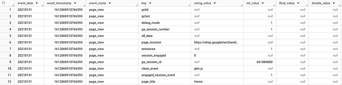 unnest関数によって、以下のようにネスト(入れ子)構造が解消されて、イベントパラメータも1行ずつで構成されるようになります。