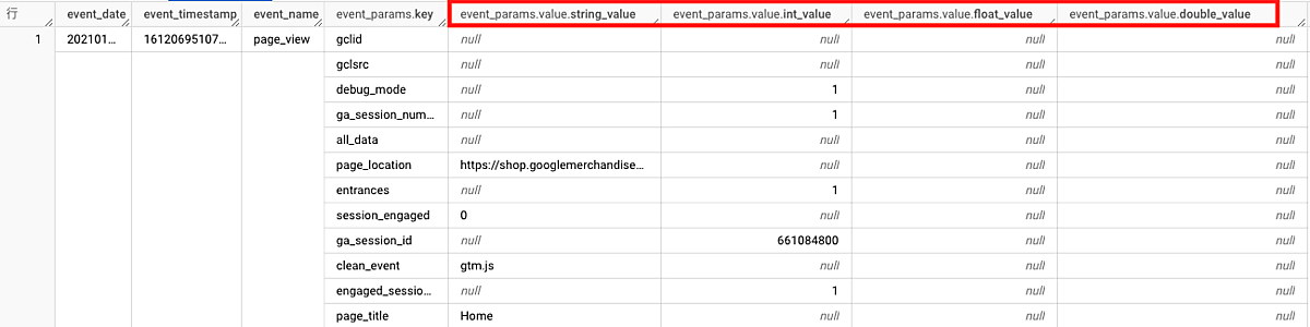 「page_location」というkey(パラメータ)に対して、「STRING型(文字列型)」の列にページURLの値が入っています。