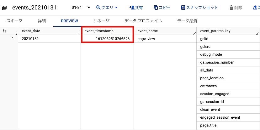 またevent_timestampは、BigQueryのPREVIEW画面で確認すると、“1612069510766593”という形で表示されています。これは数字型(INTEGER型)でイベントが発生した日時を記録しているということです。