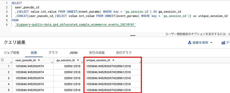 user_pseudo_idとga_session_idを連結してユニークセッションIDを作成する際に使用します。実際にuser_pseudo_idとga_session_idと、CONCAT関数を使用して連結して作成したunique_session_idを並べて確認すると、user_pseudo_idとga_session_idが連結されていることがわかります。