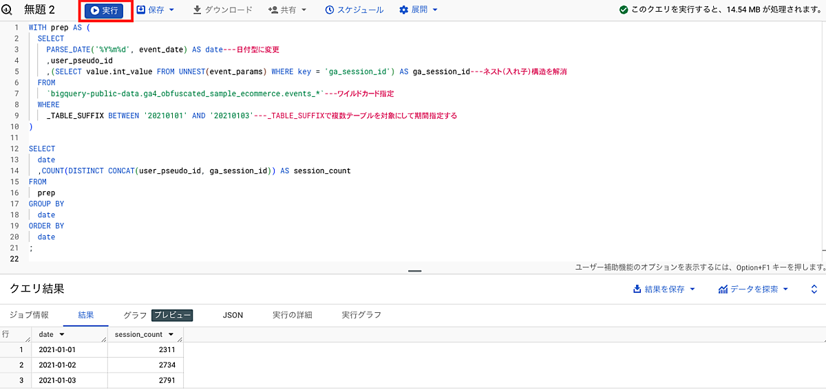 今回は、2021年1月1日から2021年1月3日のセッション数を出すクエリを例として、上記で説明した3つのデータ構造の特徴に対応するクエリを解説します。