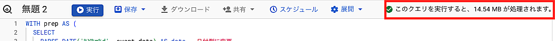 エラーを解消し実行できるクエリになると、緑のチェックマークが出てきて、処理されるデータ量も併せて表示されます。