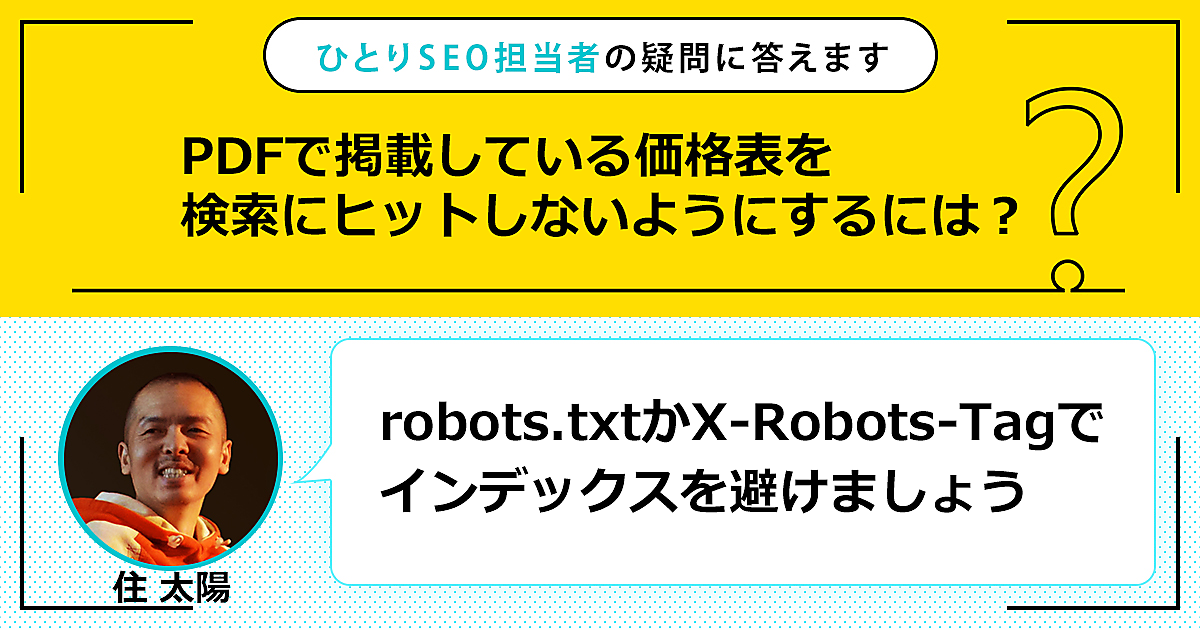 ひとりで頑張るSEO担当者さんの悩みに答える本連載。今回の質問は「PDF(で掲載している価格表)を検索にヒットしないようにするには?」です。この回答は「robots.txt か X-Robots-Tagでインデックスを避けましょう」です。