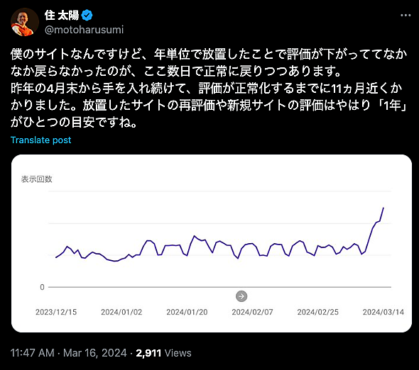 ボーディーの住太陽氏のXでの投稿を紹介する。検索トラフィックが落ちたサイトの回復に関する自身の体験だ。
