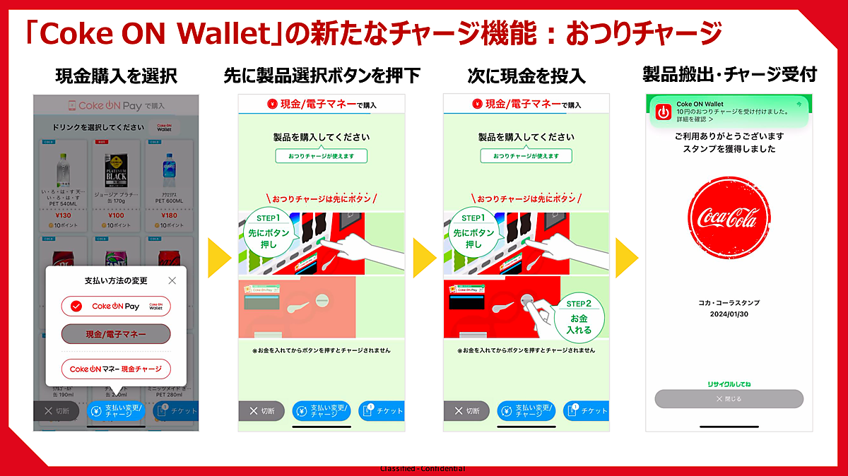 Coke ONでは2024年4月以降、新機能「自販機チャージ」が全国約30万台の自販機に随時導入される。これは自販機で電子マネー「Coke ON Wallet」がチャージできるサービスで、次の2通りのチャージ方法がある。