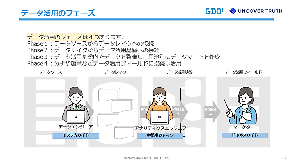企業でのデータ活用は「データ収集 → データ分析・可視化 → 顧客理解 → 施策実行からまたデータ収集へ」というようにサイクルを回していくことが理想とされる。三原氏は、それを実行するために必要なデータ活用フェーズが次の4つだと解説した。