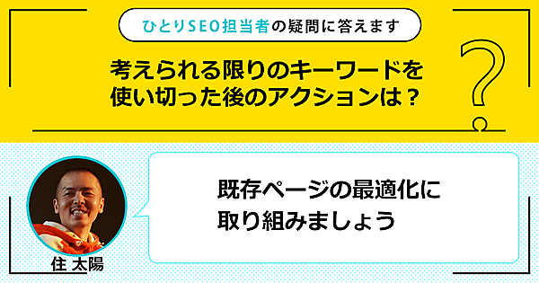 ひとりで頑張るSEO担当者さんの悩みに答える本連載。今回の質問は「考えられる限りのキーワードを使い切った後のアクションは?」です。この回答は「既存ページの最適化に取り組みましょう」です。