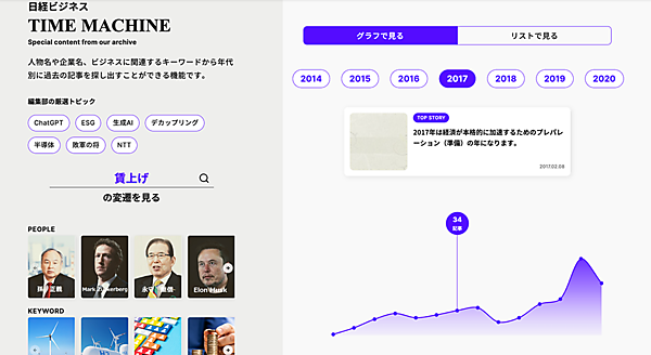 タイムレスでは、過去のコンテンツを価値に変えることを目指している。「タイムマシン」は検索機能の拡張だが、あるキーワードに対して、何年前から話題になっていたのか、日経ビジネス電子版での記事の本数がグラフィカルに表示されるようになっており、過去の記事をたどることもできる。