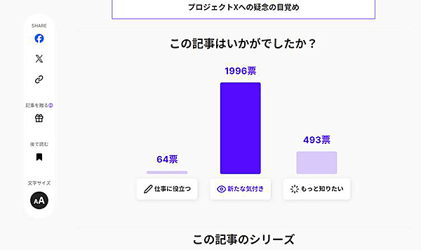 投票してもインセンティブはありませんが、純粋に記事を読んで意思表明をしたいというニーズにマッチしたのかもしれません。副次的な効果として、記者のモチベーションがアップしました。投票結果は今後のコンテンツを考えていく上でも非常に参考になります(原氏)
