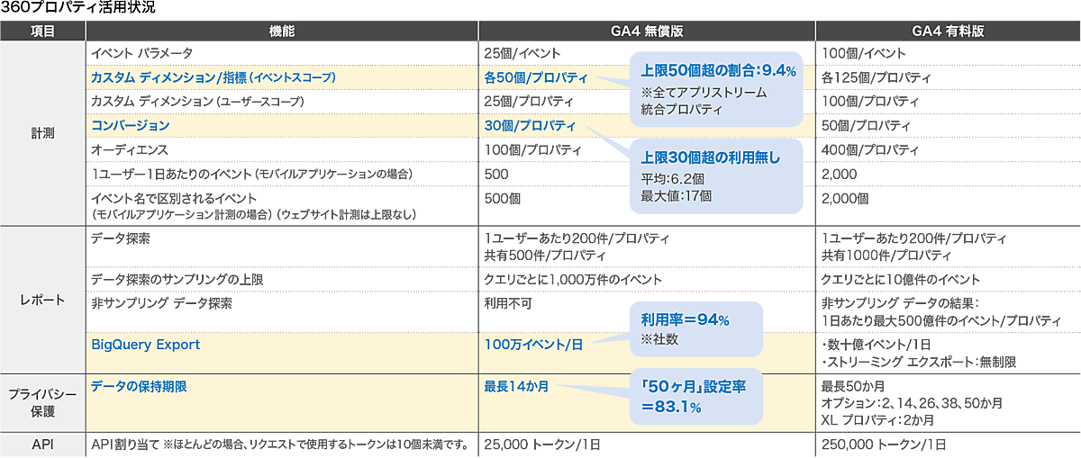 また、GA4では、プライバシー保護や法的要件への対応を目的に「データの保持期限」という機能があり、ユーザー単位のデータを最長14カ月までに設定することができる。これを超えたユーザーデータは「探索レポート」で分析することができなくなる。長期間遡って分析したい場合はBiqQuery Exportが有効だが、そうすると上記で説明した1日のExport上限が気になるところだ。このような視点においても有料版を検討するポイントになるのではないか。