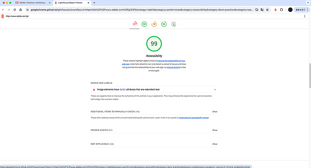 まずは、アクセシビリティを手軽にチェックできるツールで検証することをお勧めします。たとえば、Googleが提供するLighthouse。Chromeブラウザに拡張機能として追加し、自社Webサイトにアクセスし、(または、Chrome DevToolsでLighthouseタブを開き)、監査を実行すると大体1分以内に分析結果を表示します。