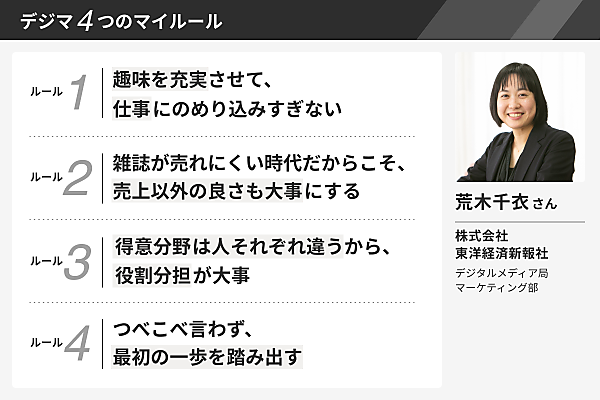 その気づきを生かして荒木氏が取り組んだのは、『週刊東洋経済』の読者と編集者との接点づくりだ。その取り組みがペルソナの明確化につながり、編集者が特集を考えるときにも役立っている。そんな荒木氏に、キャリアや仕事に関する4つのマイルールについて聞いた。