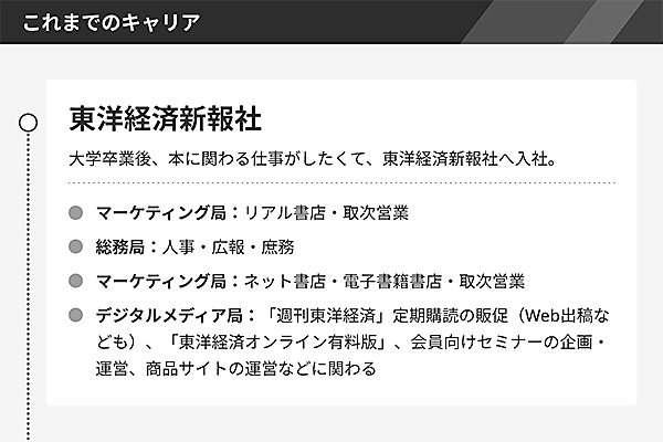 荒木氏は書店営業からキャリアをスタートし、現在は東洋経済ストアとサイトの運営やメルマガの配信も行う。現在の業務を任されたときは、必要となるHTMLやWebデザインの知識はまったくなかった。