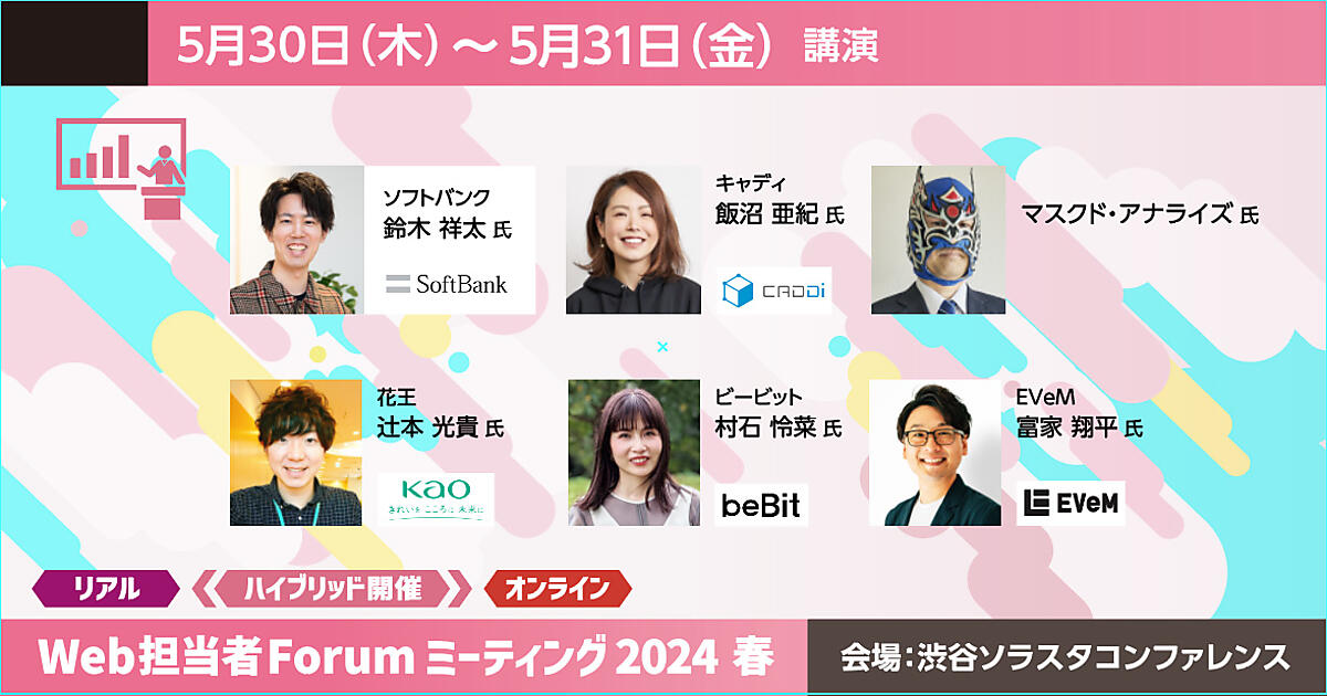 ソフトバンク、楽天グループ、ANA、花王などが登壇する「Web担当者Forum ミーティング 2024 春」を5月30日(木)、5月31日(金)に開催します。