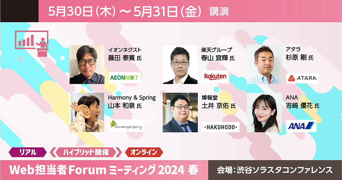 ソフトバンク、楽天グループ、ANA、花王などが登壇する「Web担当者Forum ミーティング 2024 春」を5月30日(木)、5月31日(金)に開催します。