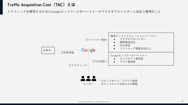 TACはTraffic Acquisition Costの略で、「トラフィック獲得コスト」と訳されます。TACとは、トラフィックを獲得するためにGoogle ネットワークのパートナーやブラウザプロバイダーに支払う費用のことです。