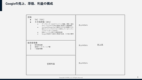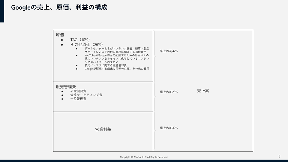 Googleの原価はTAC以外にもあり、データセンター費用やYouTubeなどのコンテンツ費用なども含めると、売上の42%ほどを占めます(2024年Q1決算情報から)。