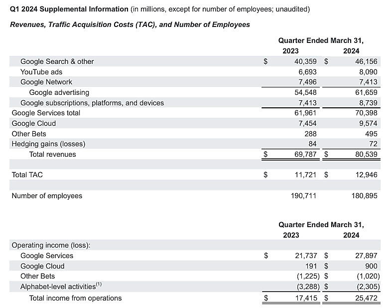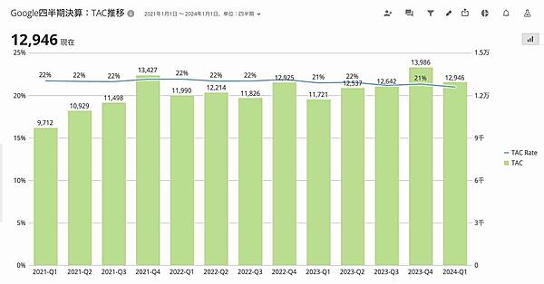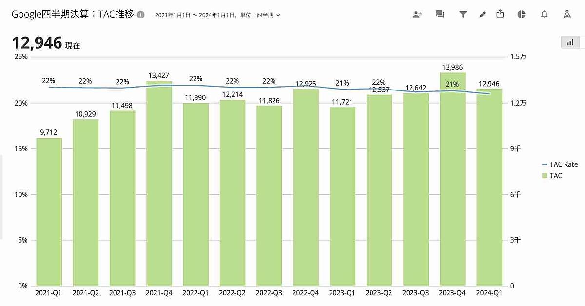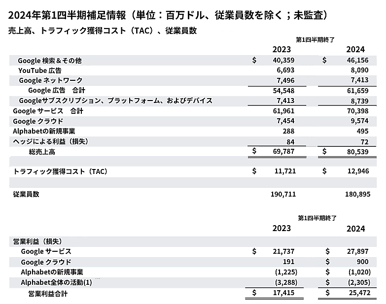 Googleの親会社であるAlphabetが2024年第1四半期の決算を発表しました。決算情報は、Alphabetの投資家情報サイトで確認できます。第1四半期の内容を簡単に振り返りつつ、前回解説した記事に加えて、もう一つの重要な指標「TAC(Traffic Acquisition Cost:トラフィック獲得コスト)」について解説したいと思います。