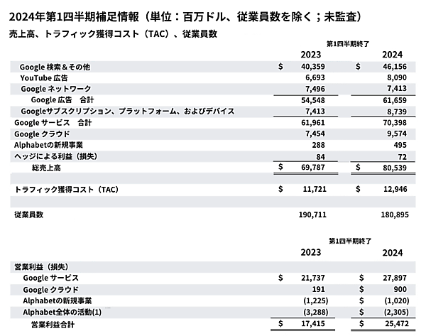 - Google subscriptions, platforms, and devices:87億3900万ドル(前年同期比+17.9%)