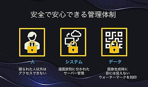 誤って他人の絵柄を学習させるなどの問題が起こらないよう、SUPERNGINEではピュアモデルAIを厳重に管理していると説明する。サーバーは漫画家別に管理されており、限られた人しかアクセスできない。また、漫画家本人が画像を生成する際には目に見えないウォーターマーク(透かし)を刻印予定だという。