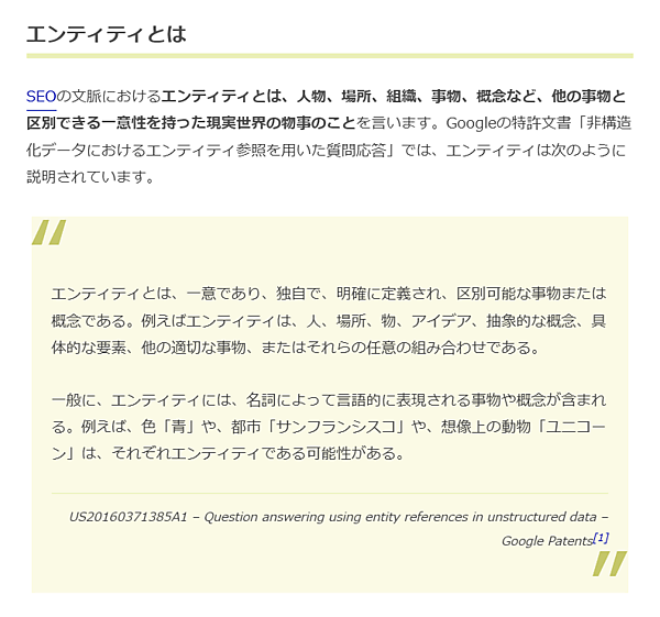 SEOの文脈における「エンティティ」とは、人物、場所、組織、事物、概念など、他の事物と区別できる一意性を持った現実世界の物事のことであるという。