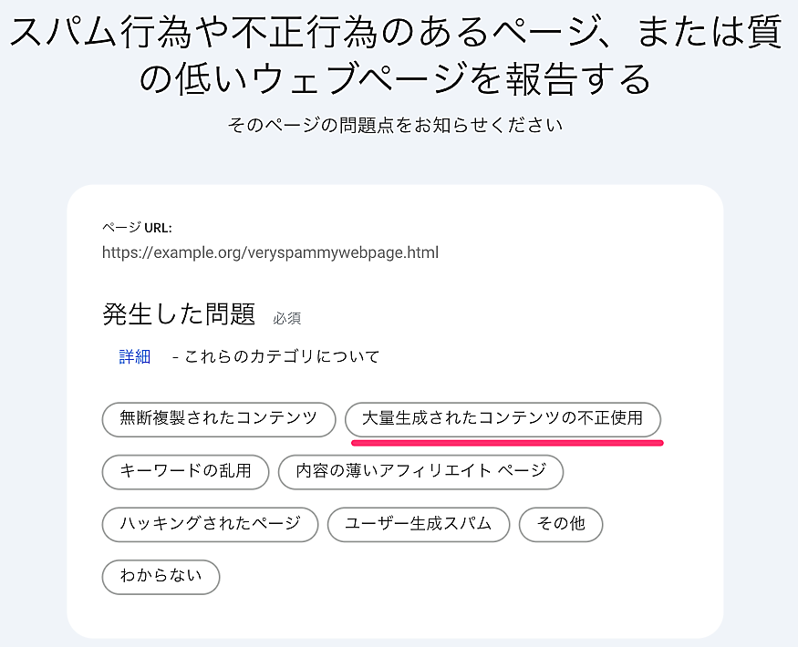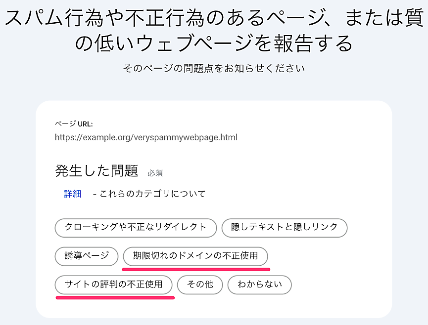 スパムレポートから報告できるスパムに、グーグルは次の3つのカテゴリを追加した。2024年3月に新たに定義されたスパムだ: