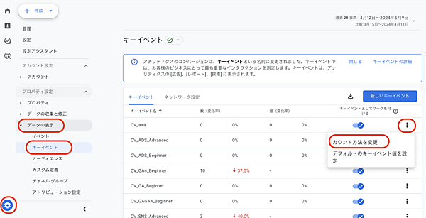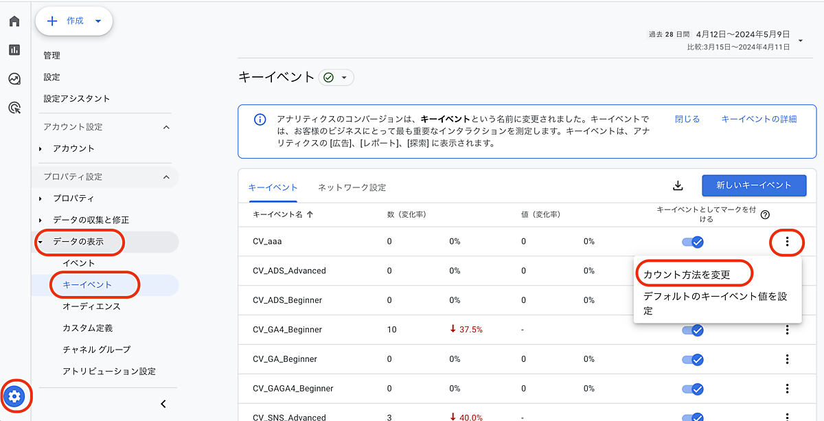 変更するには、管理>データの表示>キーイベント(コンバージョンのこと)画面で、変更したいコンバージョン右側の縦三点リーダをクリックし、「カウント方法を変更」をクリックしてください。
