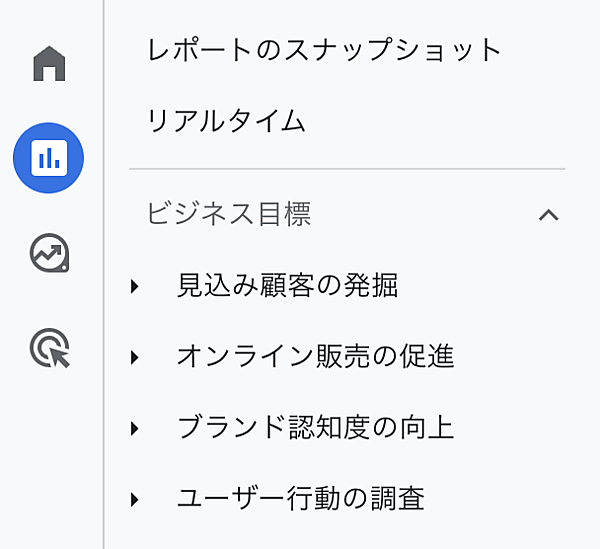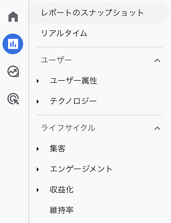 こちらが追加される前は、GA4のレポートメニューは「ユーザー」と「ライフサイクル」という大メニューのなかに「ユーザー」「集客」「エンゲージメント」などのメニューがあるという構成のみでしたが、プロパティ作成をする際の選択肢によってはまったく違うものになります。