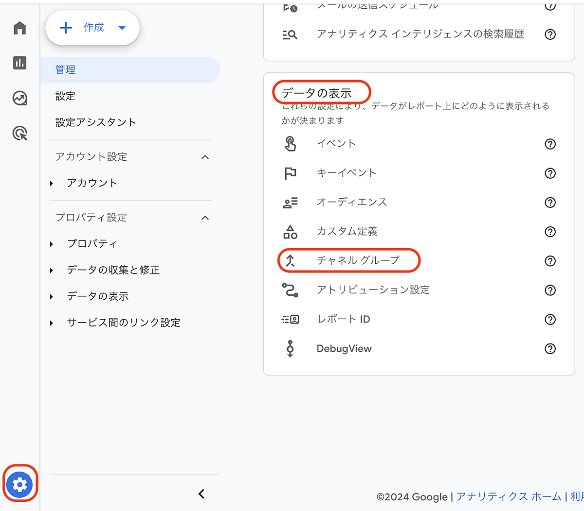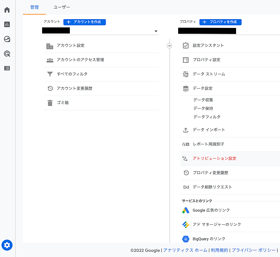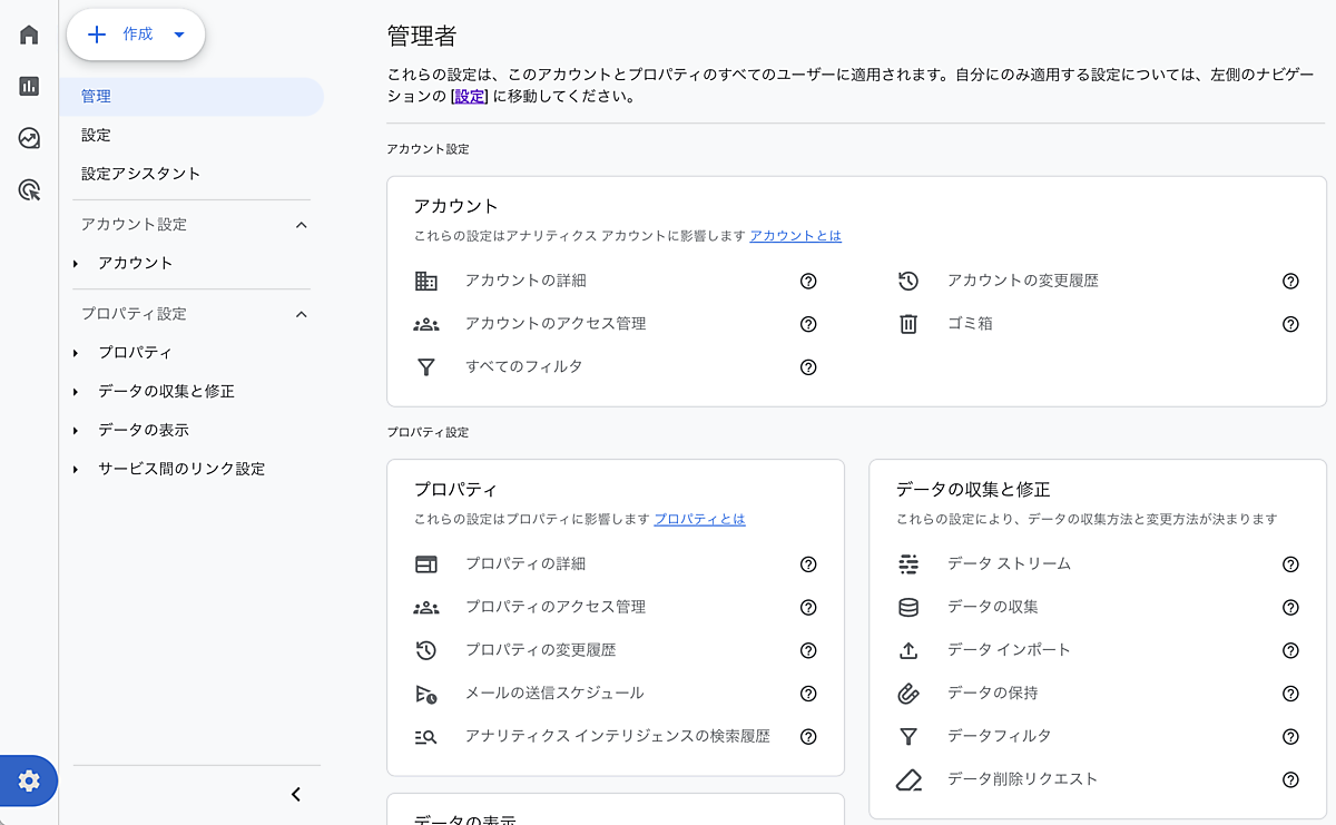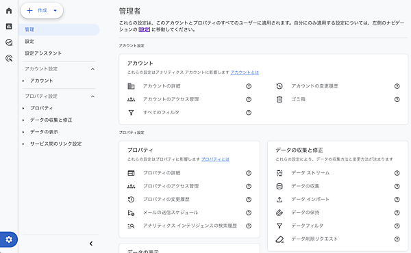 旧来は、ユニバーサルアナリティクスと同様に「アカウント」「プロパティ」と列ごとに区切りがされて管理できるものが分けられていましたが、現在ではカード形式で、「アカウント」「プロパティ」「データの収集と修正」「データの表示」「サービス間のリンク設定」と分かれています。