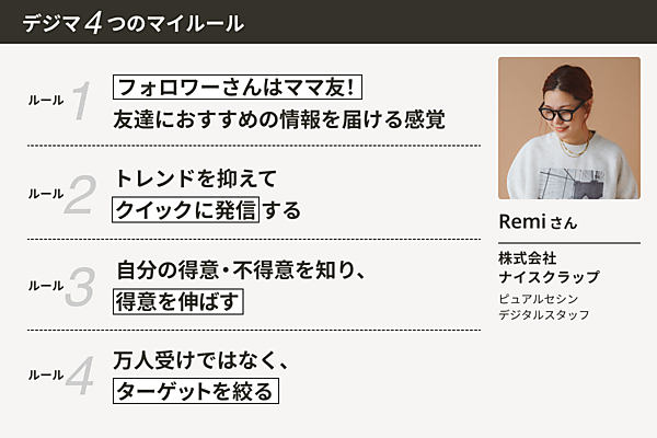 おしゃれすぎると、キラキラしたすごい人だと思われてしまいます。そうではなく『このコーディネートなら自分でもできそう』『自分ならこんな風にコーディネートするかも』と、いいと思うポイントを一つでも見つけてもらいたいです(Remi氏)