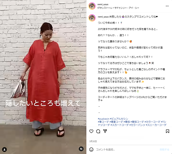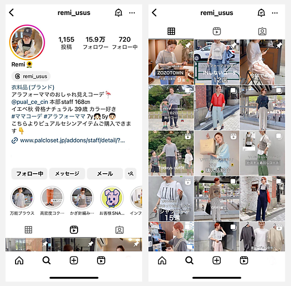この経験から、Remi氏は販売スタッフに「自分が似合うものを知って、魅力的に見えることを意識する」ことをアドバイスしている。洋服のコーディネートはもちろん、小物使いや髪型など洋服をよく見せるための工夫も大事だ。こうしたアドバイスを素直にすぐ取り入れる人は、どんどんフォロワーが増えていく。現在3万人ほどになったアカウントもある。