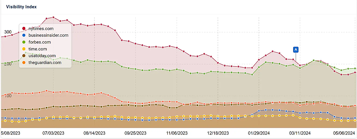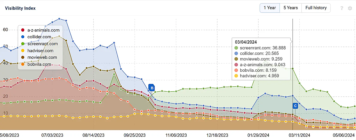 このパターンは、過去数年にわたってこれらの種類のサイトに影響を及ぼしてきたより重要な傾向に沿っており、その影響はここ数か月で強まっている。下のグラフにあるアルファベットの「A」は、3月のコアアップデートの開始時点を示す。これら6件の人気ニュースサイトのビジビリティが次第に低下していたことを示している。しかし、過去9か月を振り返ると、この低下はより大きな傾向の一部にすぎない。