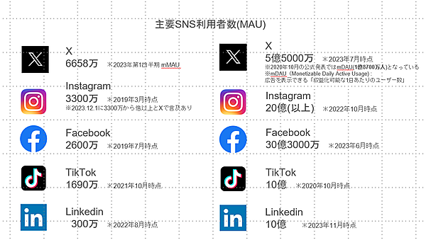 左側が国内、右側が世界での利用者数の数字です。Facebookの国内で2,600万、世界で30億3,000万の利用者は無視できないです。SNSマネージャーでは各メディアが出した数字を正としております。〇〇年〇月時点というのがメディアによってバラバラになっているのは、最新の発表がこの年月だからです。