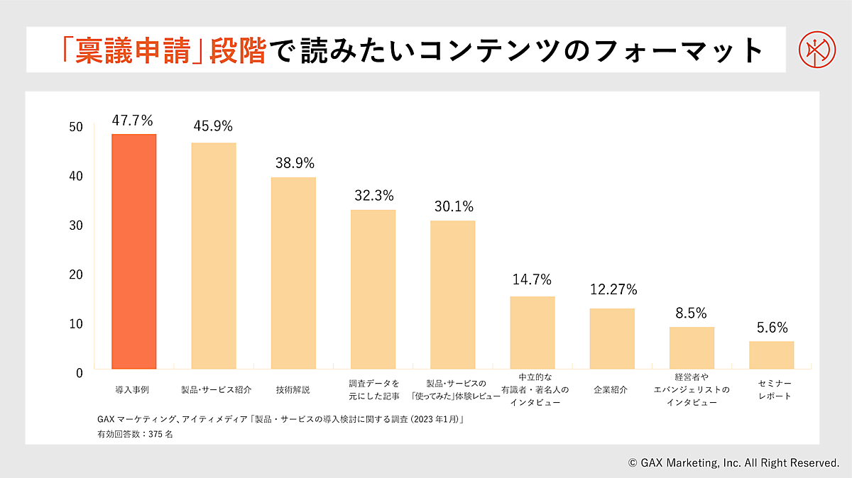 佐藤さらに買い手のメリットとして、買い手の購買活動の「情報収集」「比較検討」「稟議申請」のいずれの段階でも導入事例が活用されています。こちらも調査結果をもとに見ていきましょう。