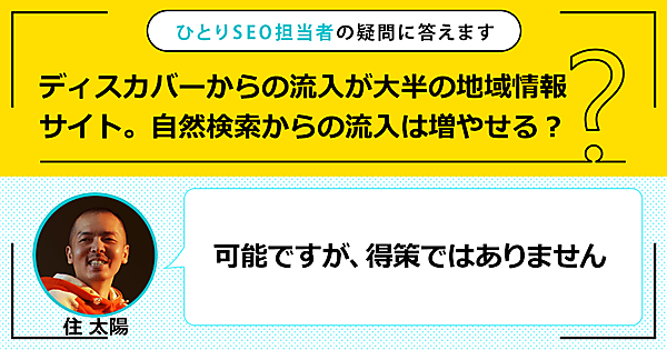 ひとりで頑張るSEO担当者さんの悩みに答える本連載。今回の質問は「地域の店舗やイベントの情報を配信する地域情報サイトを運営しているが、アクセスの大半はディスカバーから。自然検索からのアクセスは増やせる?」です。この回答は「自然検索からのアクセスを増やすのは可能ですが、ディスカバーとSNSからの流入でよいと思います」です。