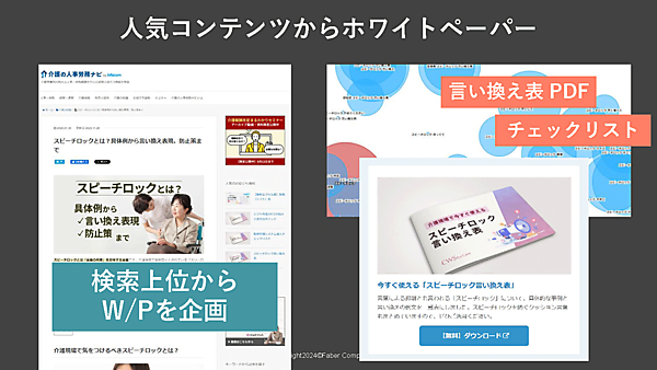 たとえば、介護の人事労務ナビにおいては、ダウンロード資料として、サービス資料のほかにホワイトペーパーを用意している。このホワイトペーパーは、内容が同じものであっても、コンテンツ前後の文脈に合わせて一つ一つCTAの内容をカスタマイズしているという。