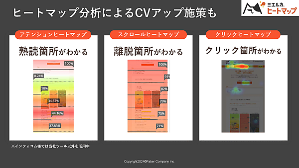 ミエルカシリーズにもUI/UX改善ツール「ミエルカヒートマップ」があるので、SEOと合わせて取り組むことで大きな成果が得られる可能性がある。一度こうしたツールで分析してみるとよいだろう。