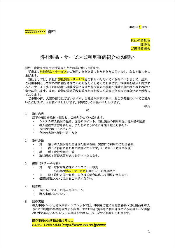 取材依頼書はテンプレートを用意しておけば、お客様に応じて最低限のカスタマイズだけでスムーズに依頼が行えるので効率的です。