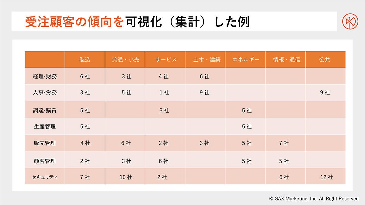 月岡なるほど。現状の受注状況が可視化できると、自社製品・サービスがどのような属性の企業にニーズがあるのかが一目瞭然ですね。