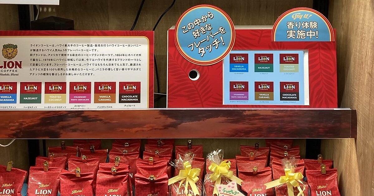 ライオンコーヒーはハワイ最大手のコーヒー製造・販売会社であるハワイコーヒーカンパニーが製造するフレーバーコーヒーで、バニラやマカダミアナッツ、キャラメル、チョコレートなど、豊富なフレーバーを売りにしている。香りを体験できる場を提供することで、購入や新規ファンの獲得につなげたいと考えたのだ。