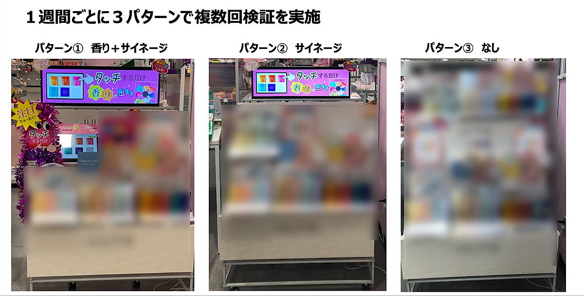 実証実験では、香りを訴求したいハンドクリームを対象に以下の3パターンで香りの販促効果を検証した。
