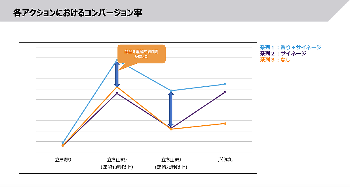 また、販促物の違いが消費者の売り場の滞留時間に影響を及ぼしていることも判明した。「香りリテールメディア+サイネージで販促」の場合、売り場に10秒以上立ち止まる人や商品に手を伸ばす人が増えた。東芝テックでは、「滞留時間が延びたことが商品への興味・関心を誘起し、購買につながったのではないか」と推測する。