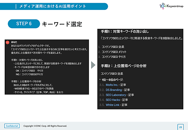 たとえば、生成AIに「“コンテンツSEO”というテーマで検索に上位表示するために記事を書きたいと考えています。上位獲得すべき対策キーワードを選定してください」などのプロンプトを投げることで、「コンテンツSEO 効果」「コンテンツSEO メリット」「コンテンツSEO やり方」など、記事で対策すべきキーワードを選定してくれる。また、実際に検索上位に表示されているページの分析なども生成AIが行ってくれるという。